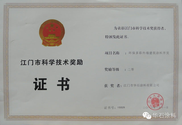 經(jīng)過重重考核,華石涂料申報的《環(huán)保多彩外墻建筑涂料開發(fā)》項目榮獲2015年度江門市科學技術獎二等獎!